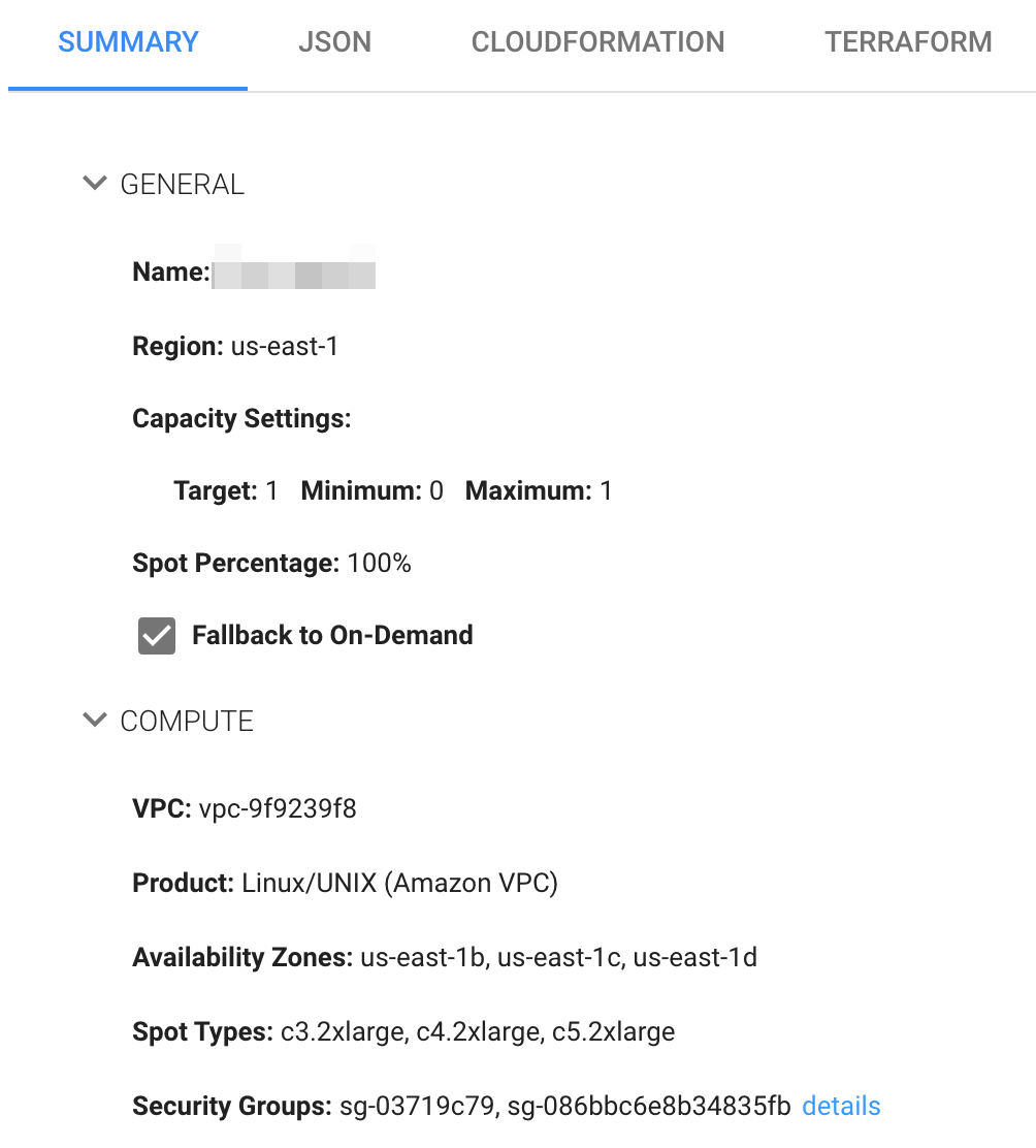 In the Review tab under Summary, you can review the final configuration of your Elastigroup. In addition, the Spot automatically generates a template of your Elastigroup to be used by CloudFormation or Terraform.